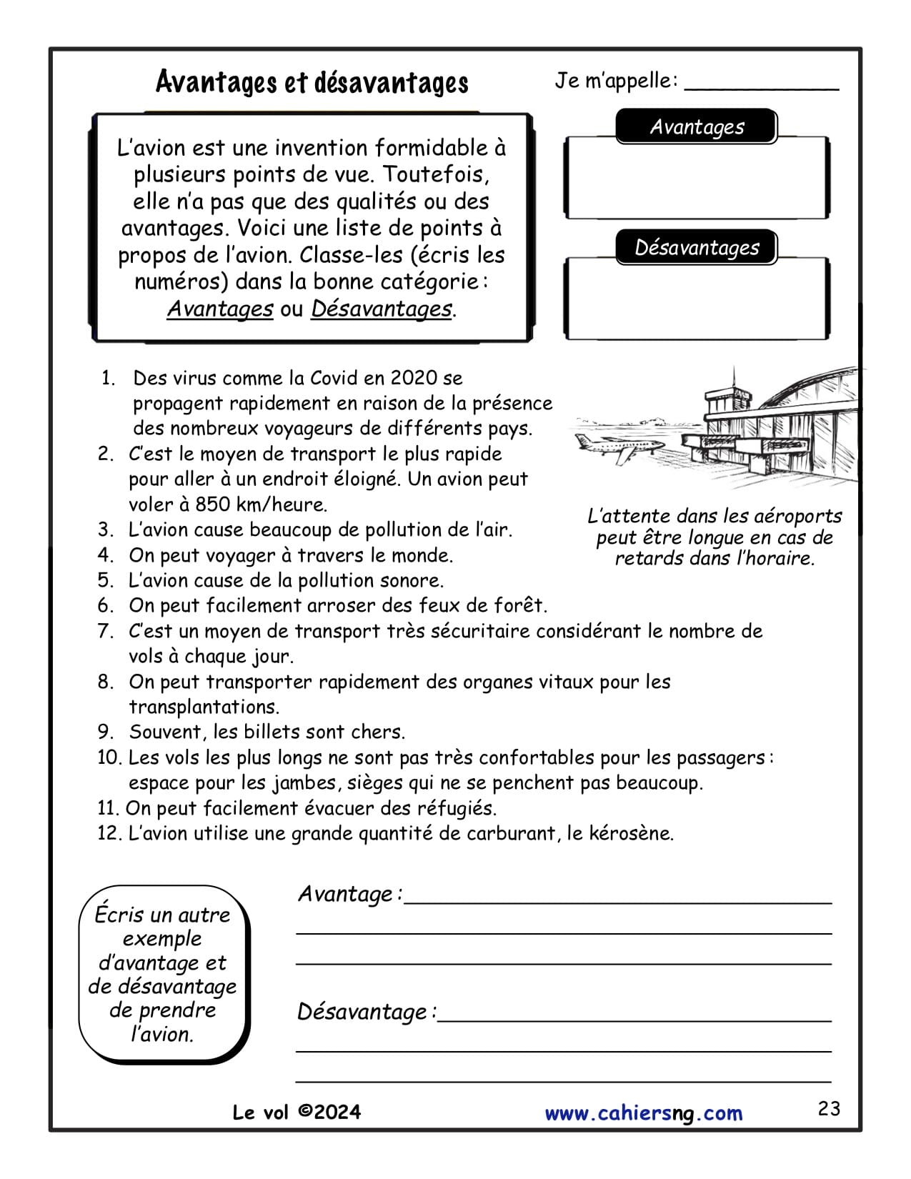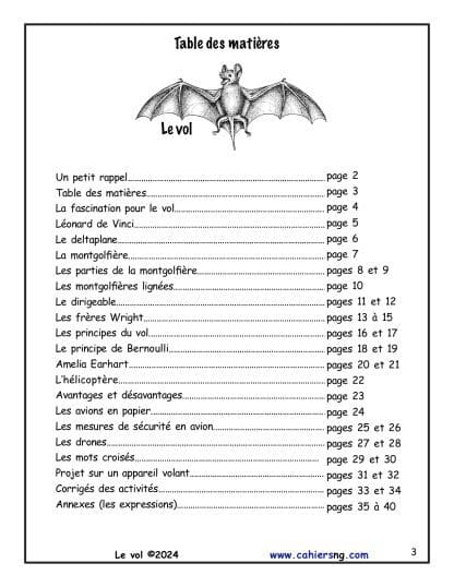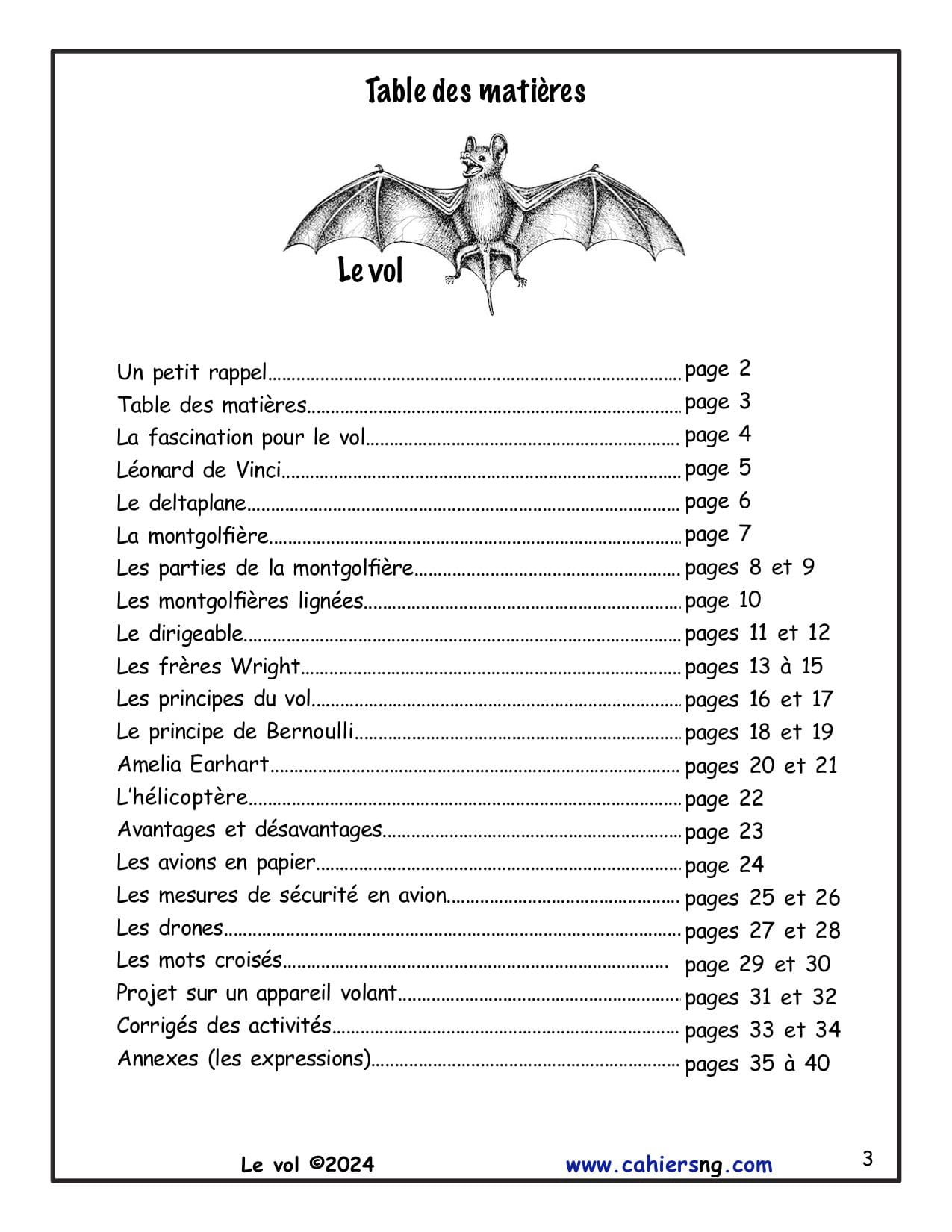 Voici 28 pages d’activités sur le vol. On y aborde la fascination pour le vol, les principes du vol, les frères Wright, Amelia Earhart, la montgolfière, le principe de Bernoulli, les mesures de sécurité en avion, l’hélicoptère et les drones. Projet sur un appareil volant. Les corrigés sont inclus. Pour des élèves de 6e année.