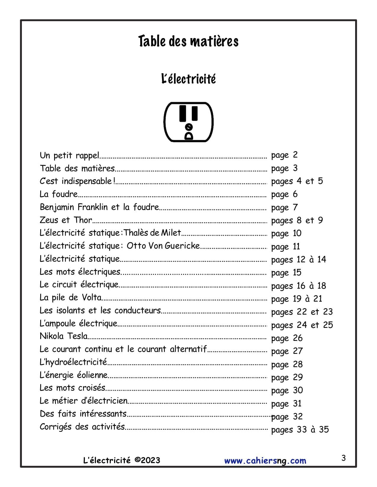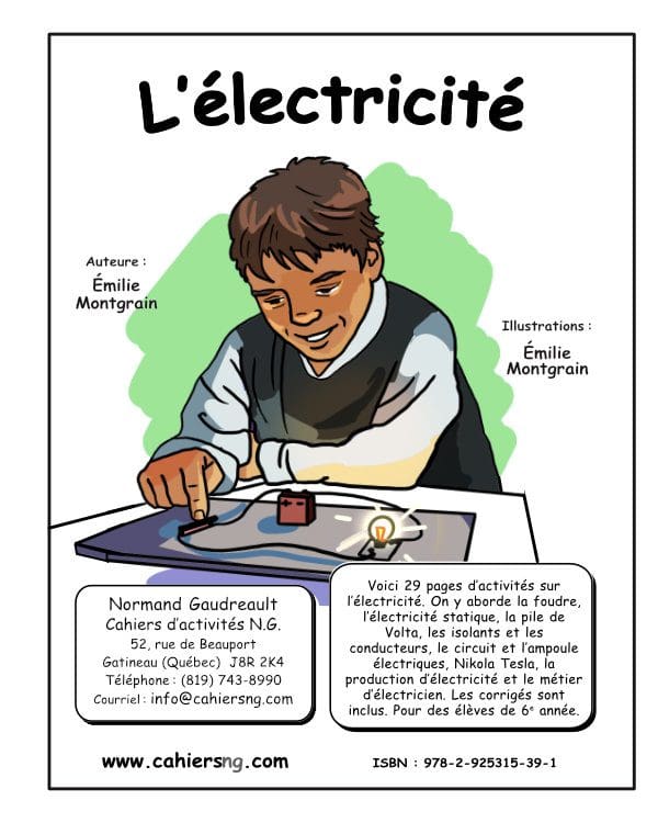 Voici 29 pages d’activités sur l’électricité. On y aborde la foudre, l’électricité statique, la pile de Volta, les isolants et les conducteurs, le circuit et l’ampoule électriques, Nikola Tesla, la production d’électricité et le métier d’électricien. Les corrigés sont inclus. Pour des élèves de 6e année.