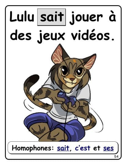Avec l’aide de Lulu la chatte et de Gugus le chien, voici un document de 32 affiches mettant en vedette des groupes d’homophones: on-ont, à-a, son-sont, et-est, ou-où et plusieurs autres. Les affiches sont en couleur et en noir et blanc. Illustrations et colorisation: Lou Frenette-Gaudreault