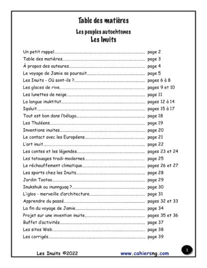 Voici 33 pages d’activités de lecture, de vocabulaire, de recherche sur le peuple autochtone des Inuits. On y aborde l’histoire, les personnages importants, les traditions, la culture et l’avenir des Inuits au Canada. Ces lectures et activités vont rejoindre tous nos élèves du cycle moyen. Les corrigés sont inclus. Pour des élèves de 5e et de 6e années.