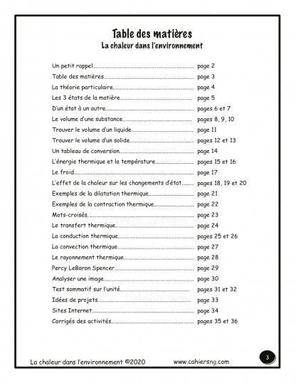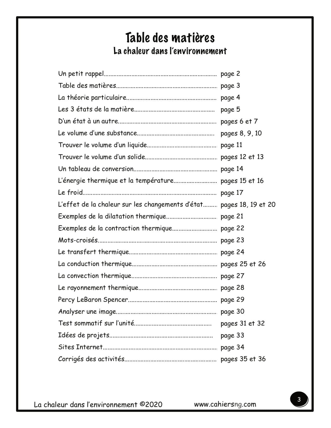 Voici trente pages d’activités de compréhension de lecture, de vocabulaire, de la démarche scientifique, de mathématiques sur la chaleur dans l’environnement (la température, la chaleur, la théorie particulaire, l’énergie et le transfert thermiques, etc) . 7e année. Test sommatif. Les corrigés sont inclus.