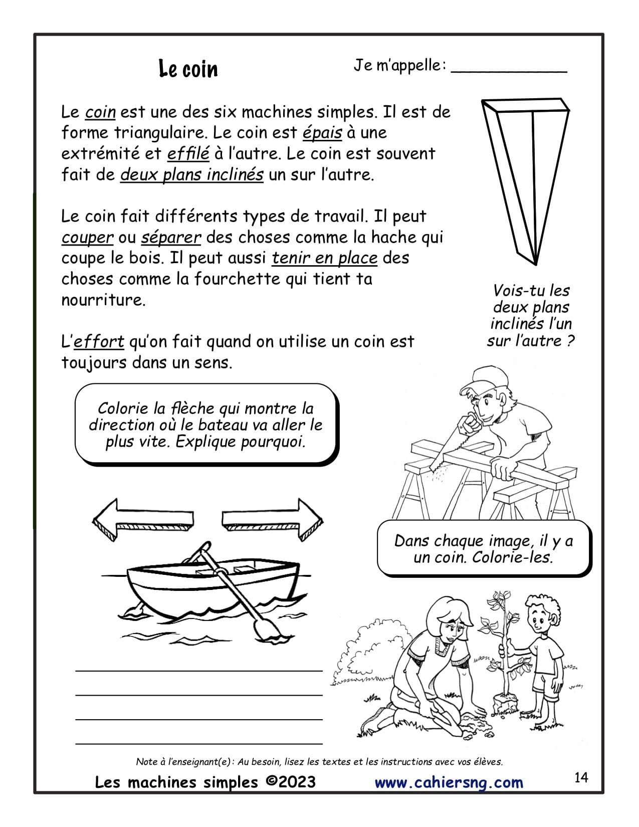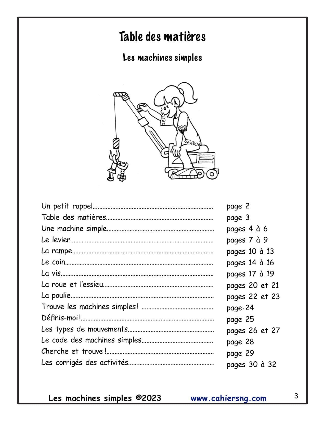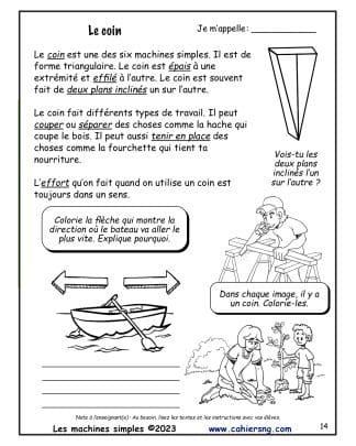 Voici 26 pages d’activités sur les machines simples. On y aborde les différents types de machines simples comme le coin, la vis, le levier, le plan incliné, la roue et la poulie. Les corrigés sont inclus. Pour des élèves de 2e et 3e années.