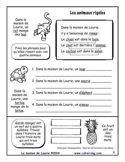 Les animaux sont devenus fous dans la maison de Laurie. Voici 11 pages d’activités de lecture, de vocabulaire et d’inférences. Les corrigés sont inclus. Pour des élèves de 3e et de 4e années.