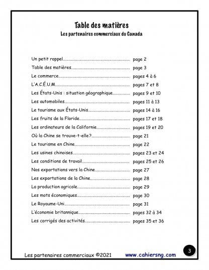 Voici un document de trente-deux pages d’activités de compréhension de lecture, de vocabulaire et de grammaire sur les partenaires commerciaux du Canada comme la Chine, la Grande-Bretagne et les États-Unis. On y apprend ce que sont les exportations et les importations pour le Canada, le fonctionnement de l’ACÉUM avec le Mexique et les États-Unis, la distribution des fruits de la Floride, les ordinateurs de la Californie, les usines, le commerce et les conditions de travail en Chine, les véhicules électriques, le Brexit et l’économie britannique, etc. Pour des élèves de 6e et 7e années. Corrigés inclus.