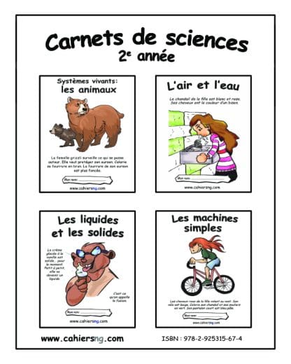 Voici quatre livrets d’activités complémentaires langagières de sciences : L’air et l’eau, Systèmes vivants: les animaux, Les machines simples, Les liquides et les solides. Document reproductible pour des élèves de 2e année. Pour ces petits carnets de sciences, vous devez faire des photocopies recto-verso (ex: les pages 1 et 2 vont ensemble, les pages 3 et 4, les pages 5 et 6 et finalement les pages 7 et 8). Vous pliez ensuite les 4 feuilles pour former le petit livret. À la page 9, vous avez les corrigés des activités. Ces quatre documents peuvent aussi être commandés individuellement. Voir les liens plus haut.