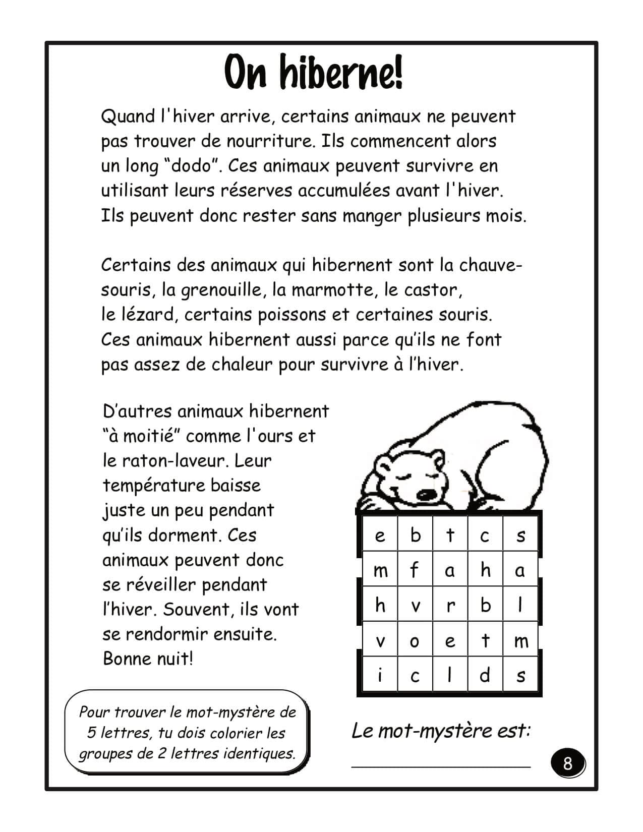 Voici un petit livret d’activités de 16 pages sur l’hiver. Activités langagières de vocabulaire, de lecture et d’écriture (pourquoi on aime moins l’hiver, l’hibernation chez les animaux, les activités d’hiver, les oiseaux qui hivernent, ce qui est blanc, les vêtements etc). Corrigés inclus. En version PDF seulement! 3e/4e années.