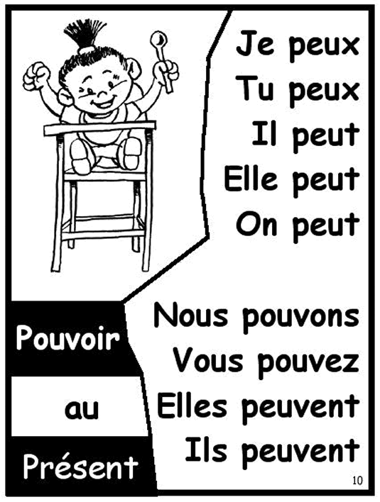 Trente affiches de verbes communs (aimer, aller, avoir, dire, prendre, être, faire, finir, pouvoir, savoir) au présent, à l’imparfait et au futur proche.