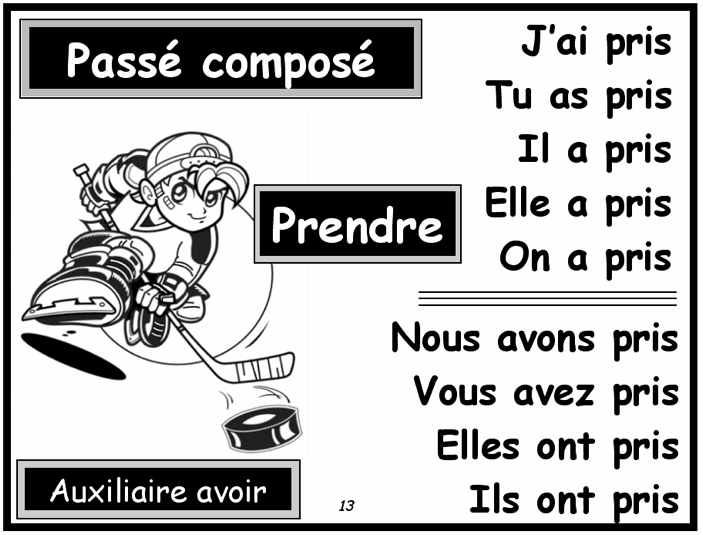 Trente affiches de verbes communs (aimer, aller, avoir, dire, prendre, être, faire, finir, vouloir, partir) au passé composé, au plus-que-parfait et au futur simple.