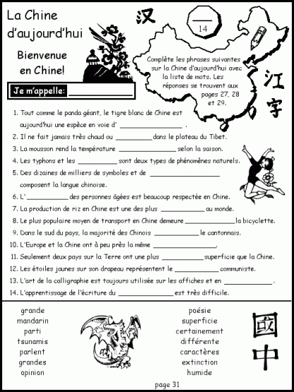 Voici 37 pages d’activités de compréhension de lecture, de vocabulaire et de grammaire sur la Chine comme ancienne civilisation. Les activités portent notamment sur les inventions chinoises, la Grande Muraille, Confucius, les empereurs etc. Corrigés inclus. Pour des élèves de 4e ou 5e année selon la province ou territoire.