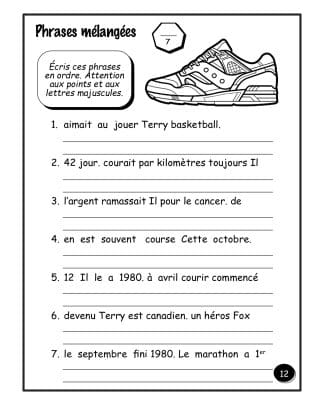 Petit livret thématique de 16 pages sur Terry Fox. Activités de vocabulaire, de lecture, de compréhension et de grammaire. En version PDF. Corrigés inclus. Pour ces livrets, vous devez faire des photocopies recto-verso (ex: les pages 1 et 2 vont ensemble, les pages 3 et 4, les pages 5 et 6 et finalement les pages 7 et 8). Vous pliez ensuite les 4 feuilles pour former le petit livret. À la page 9, vous avez les corrigés des activités.