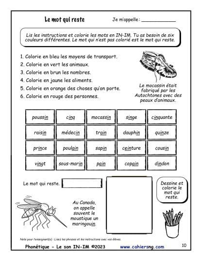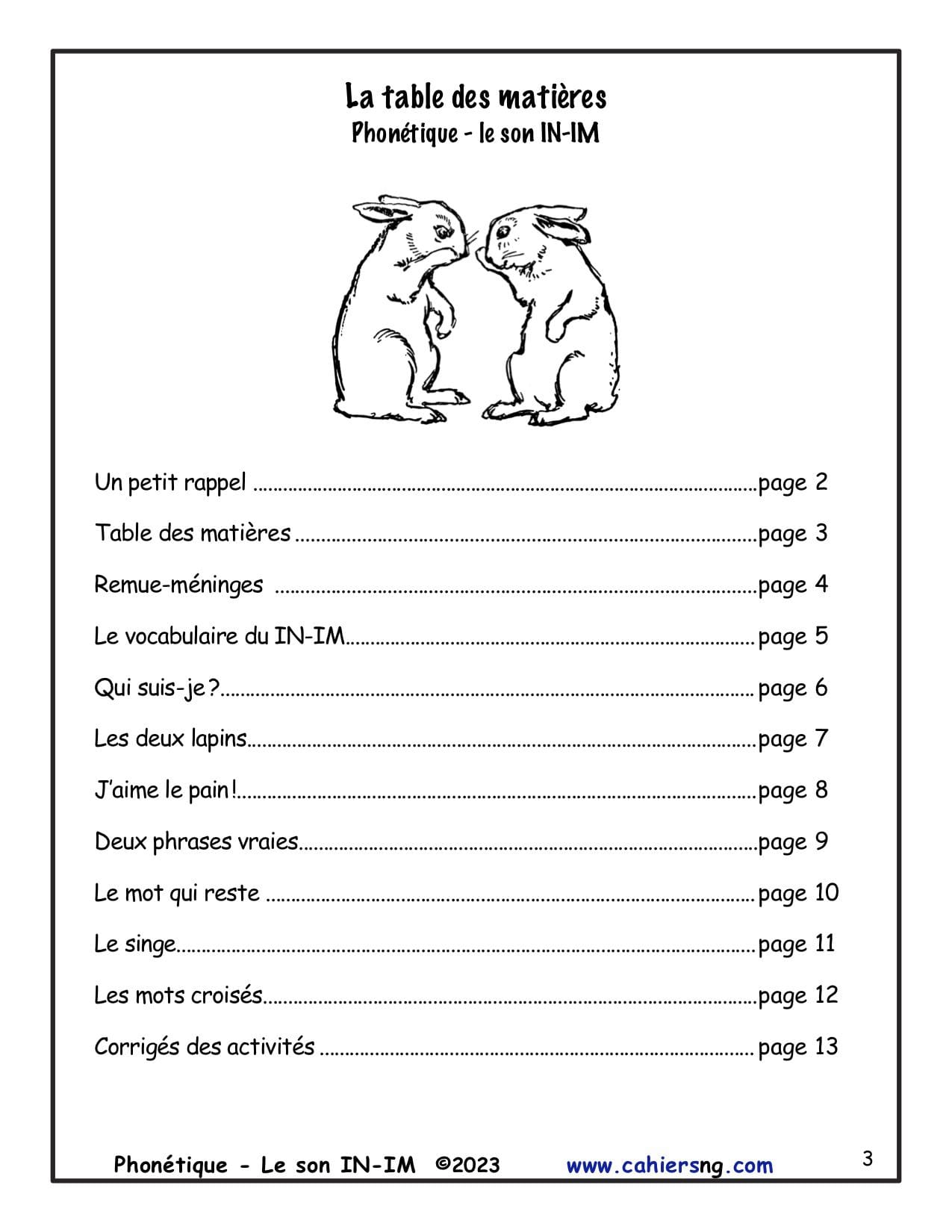 Voici 9 pages d’activités sur le son IN-IM. Les activités portent sur la lecture, le vocabulaire, la grammaire et la compréhension. Les corrigés sont inclus. Pour des élèves de 2e et de 3e années.