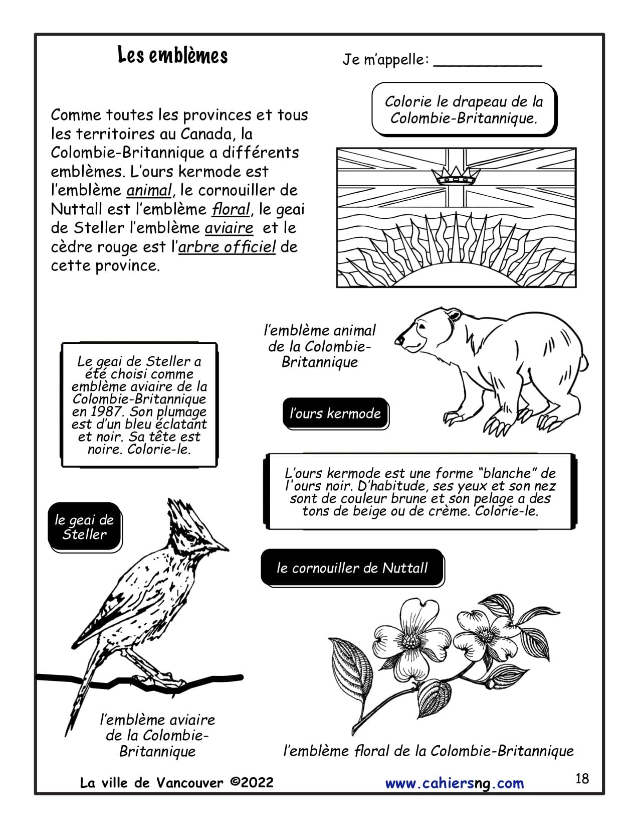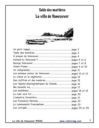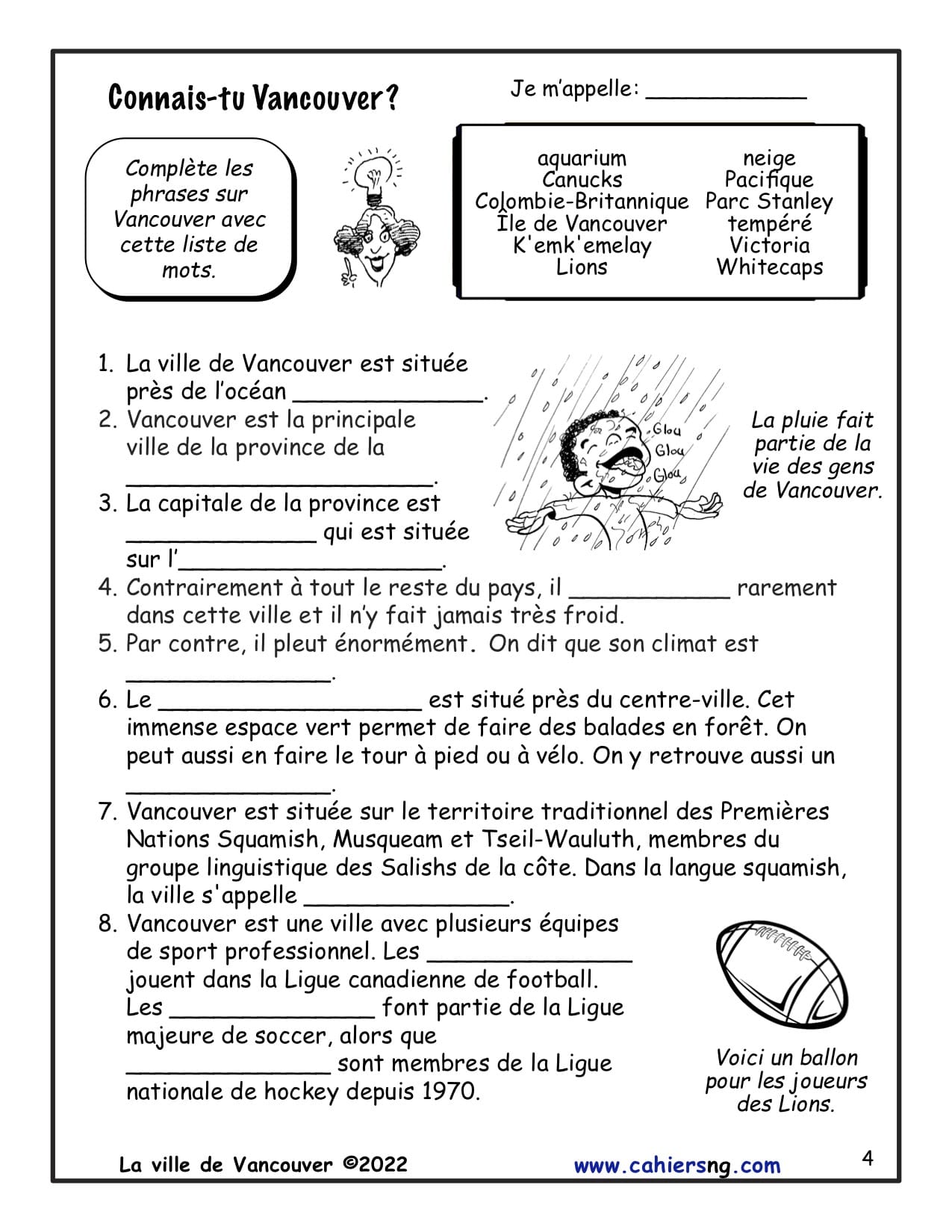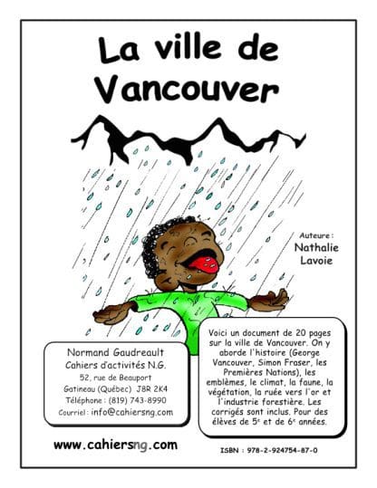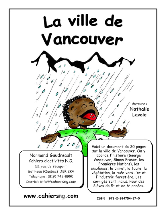 Voici un document de 20 pages sur la ville de Vancouver. On y aborde l’histoire (George Vancouver, Simon Fraser, les Premières Nations), les emblèmes, le climat, la faune, la végétation, la ruée vers l’or et l’industrie forestière. Les corrigés sont inclus. Pour des élèves de 5e et de 6e années.